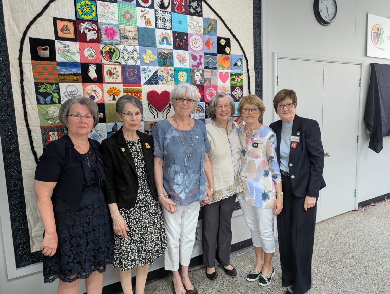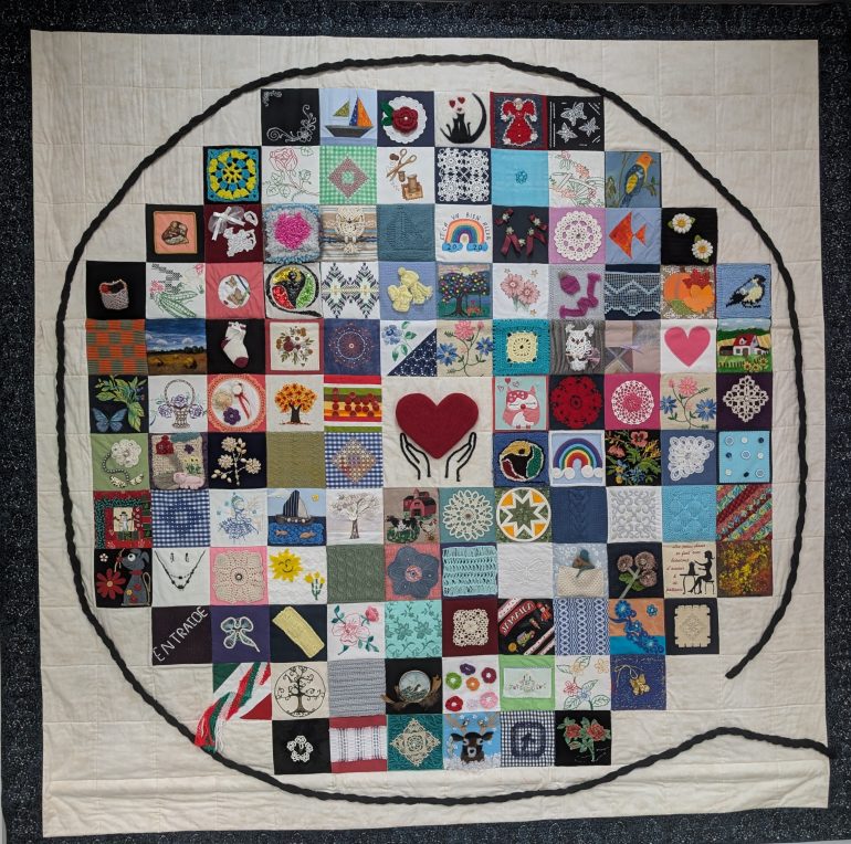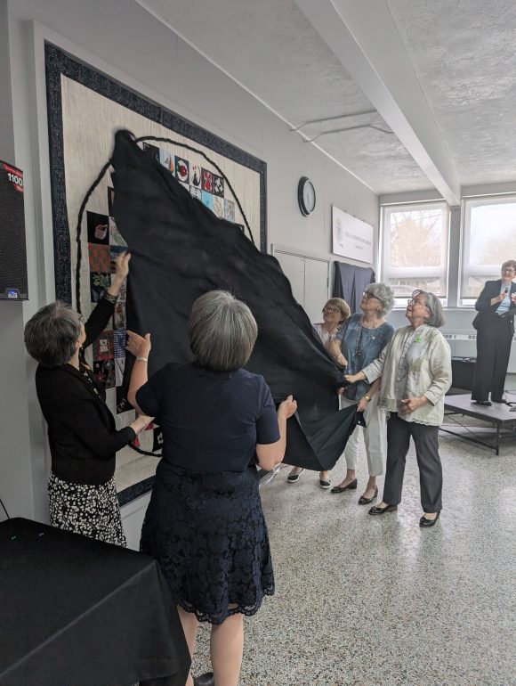 Chaque carré a été conçu par une artisane selon un format précis et témoigne de sa fierté de faire partie du groupe. La courtepointe, suspendue solidement au mur, est aussi accompagnée d’un dos documenté retraçant la fabrication et les participantes.