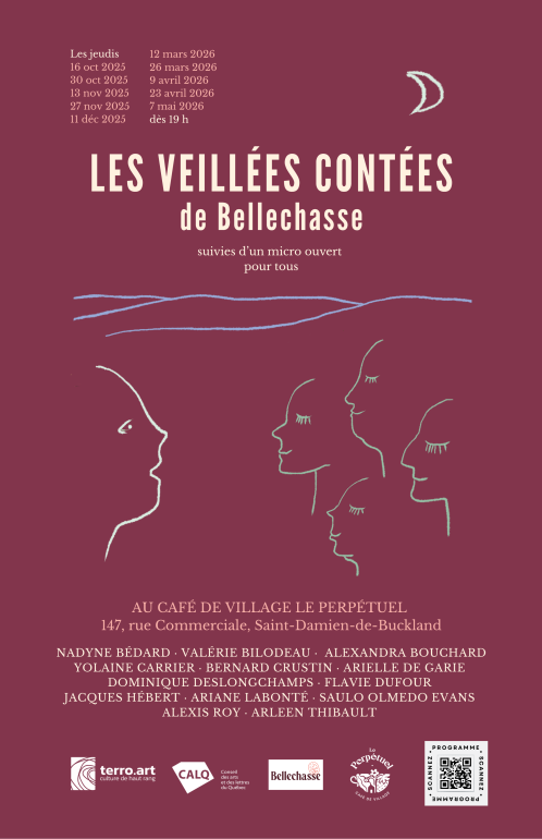 Les Veillées contées sont rendues possibles grâce au soutien du Conseil des arts et des lettres du Québec (CALQ) et de la MRC de Bellechasse. L’événement célèbre la parole vivante et offre à la communauté un espace de rencontre, de créativité et de plaisir partagé.
