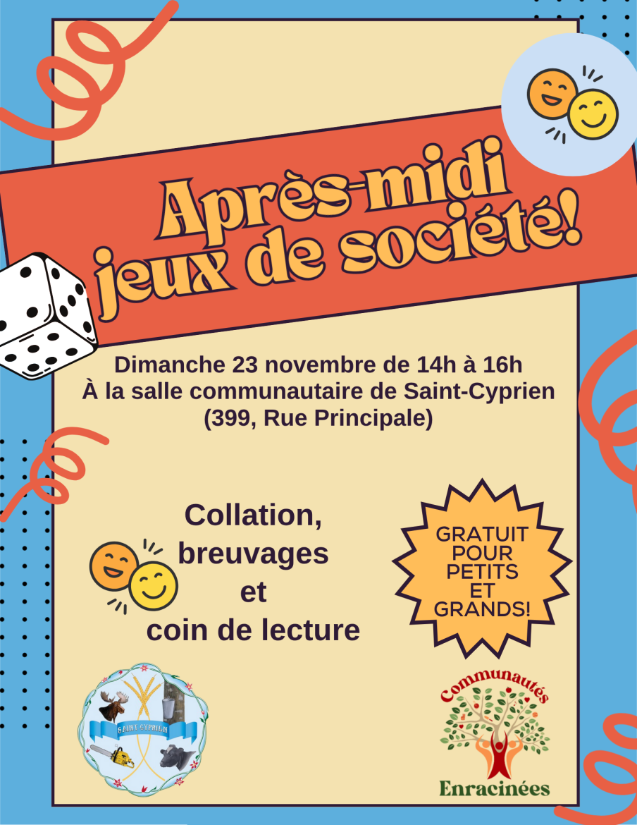 Deux initiatives communautaires gratuites, organisées en collaboration avec le réseau Communautés Enracinées, animeront le mois de novembre dans Les Etchemins. À Saint-Cyprien, un après-midi dédié aux jeux de société se tiendra le dimanche 23 novembre, de 14 h à 16 h, à la salle communautaire située sur la rue Principale. L’activité proposera des jeux pour tous les âges, un coin lecture présenté par la bibliothèque municipale ainsi que collations et […]