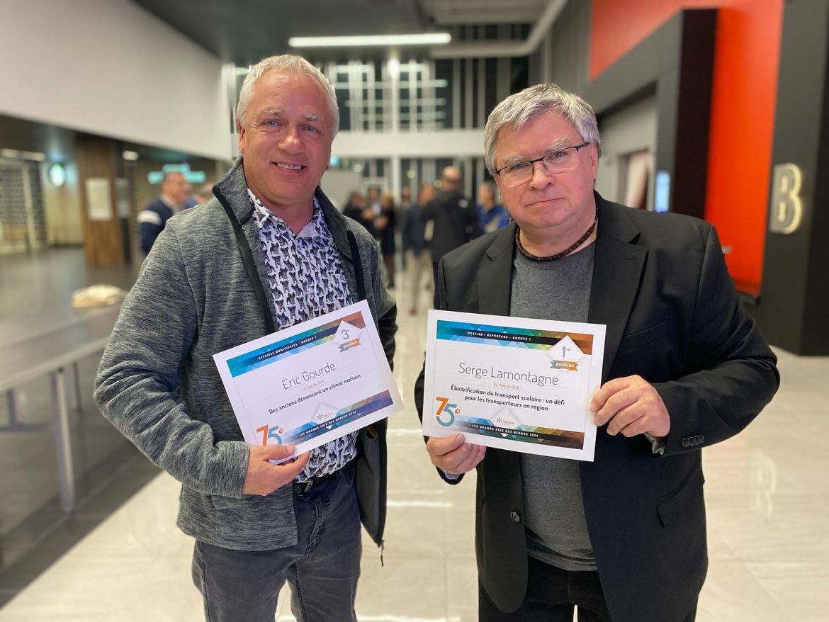 Les journalistes de La Voix du Sud Serge Lamontagne et Éric Gourde ont tous les deux remporté des récompenses à l’occasion de la 75e édition des Grands Prix des Hebdos du Québec, qui s’est tenue mardi soir à Trois-Rivières.  Monsieur Lamontagne a terminé au 1er rang de la catégorie Dossier/reportage pour son texte «Électrification du transport scolaire: un défi pour les transporteurs en région», paru en juin dernier dans l’hebdo […]