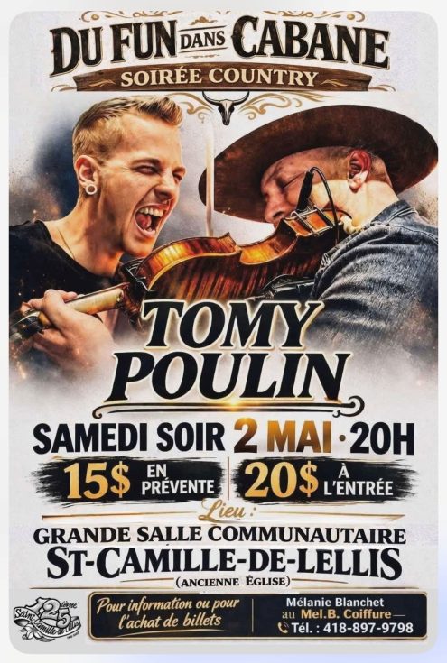 Le comité des Fêtes du 125e vous invite à une soirée country avec le duo ”Du fun dans cabane” avec Tomy Poulin, ce samedi 02 mai dès 20 h 00 à la salle communautaire (église) de St-Camille-de-Lellis. Les profits seront remis au comité des Fêtes du 125e prévue en 2027.  Les billets en pré-vente au coût de 15,00 $ jusqu’à vendredi, par la suite à l’entrée au coût de 20,00 $. Plaisir garanti, venez nombreux !!  Pour information et/ou réservation, contactez Mélanie Blanchet au 418 897-9798.