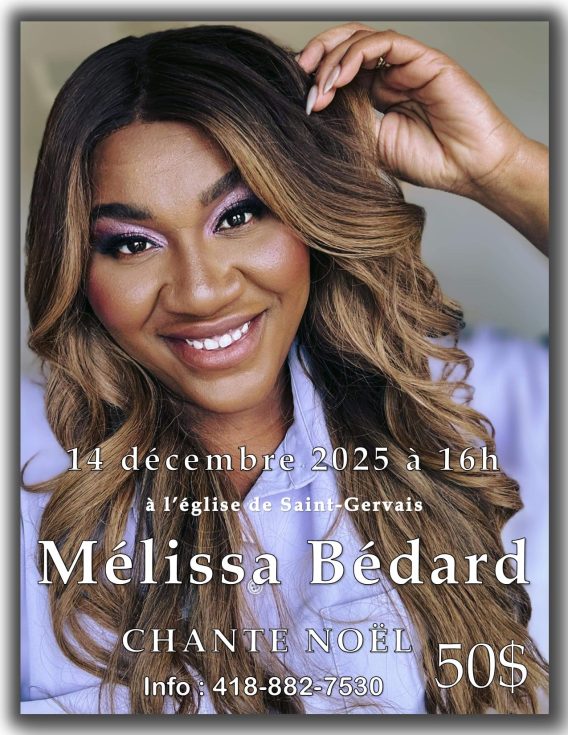 Mélissa Bédard chante Noël le dimanche 14 décembre en l’église de St-Gervais à compter de 16 h 00.   Le coût est de 50,00 $ par personne.  Pour information, contactez  Myriam au 418 882-7530.  Une invitation du Comité de consultation et d’organisation locale de St-Gervais.